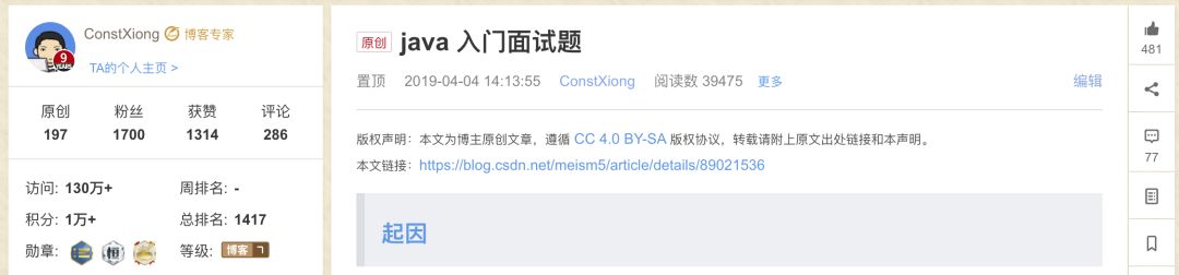 于是开始了在 CSDN 自己作答网上的 Java 面试题,没想到获得了 39475 次浏览,481 个赞和 77 个评论。