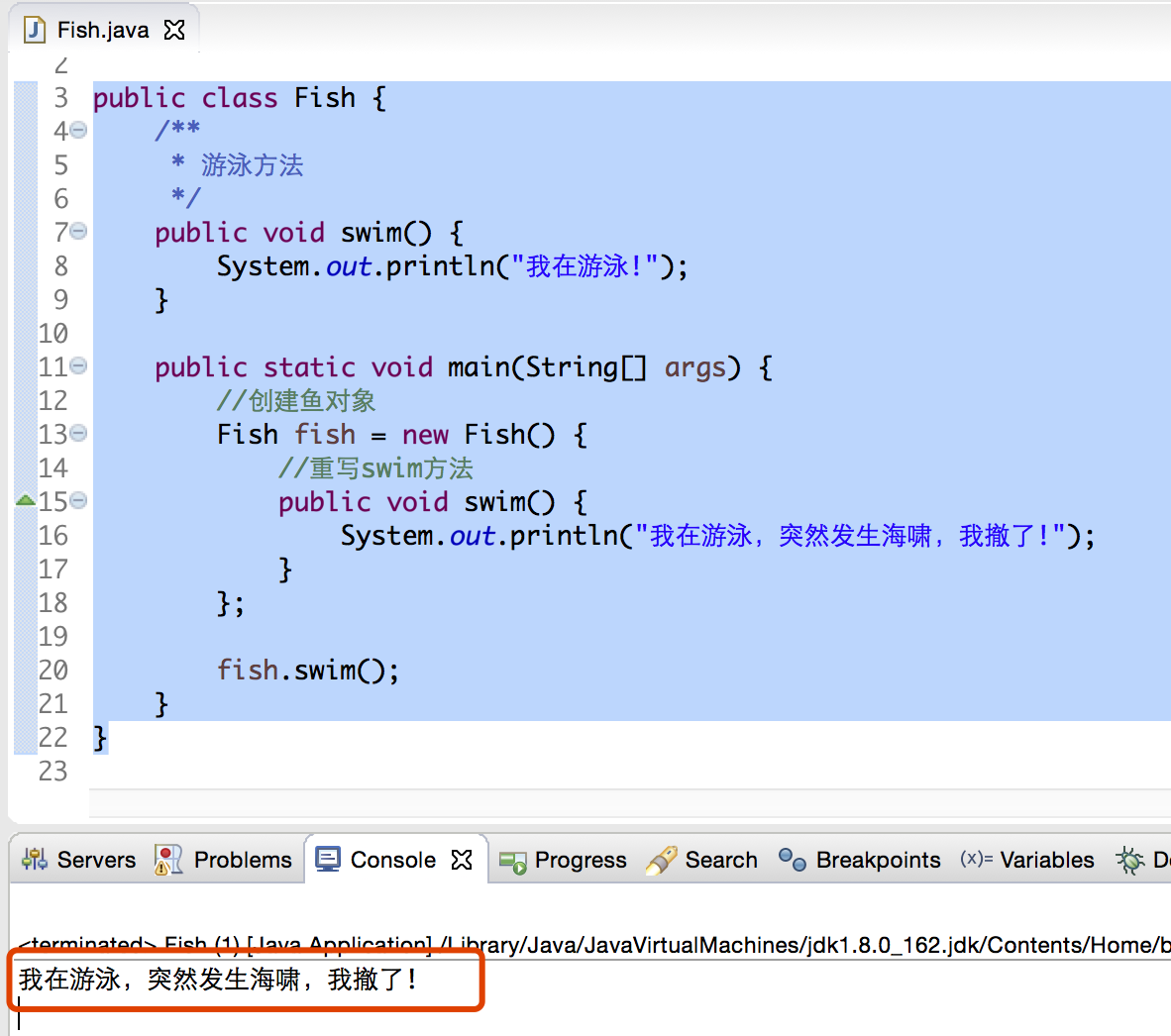System.out.println("我在游泳,突然发生海啸,我撤了!");